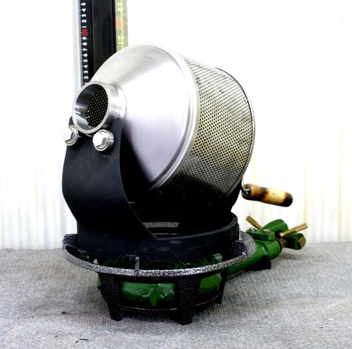 商品番号:46 2kg〜2,5kg 販売価格:20万 1,5kg平均ですが最大2,5kgまで焙煎可能です 1kgタイプの土台は23センチですがこのタイプは32センチ有ります 大型ですコンロ付きです豆入口に煙の出る調整出来る蓋を付けています 圧力をかけます