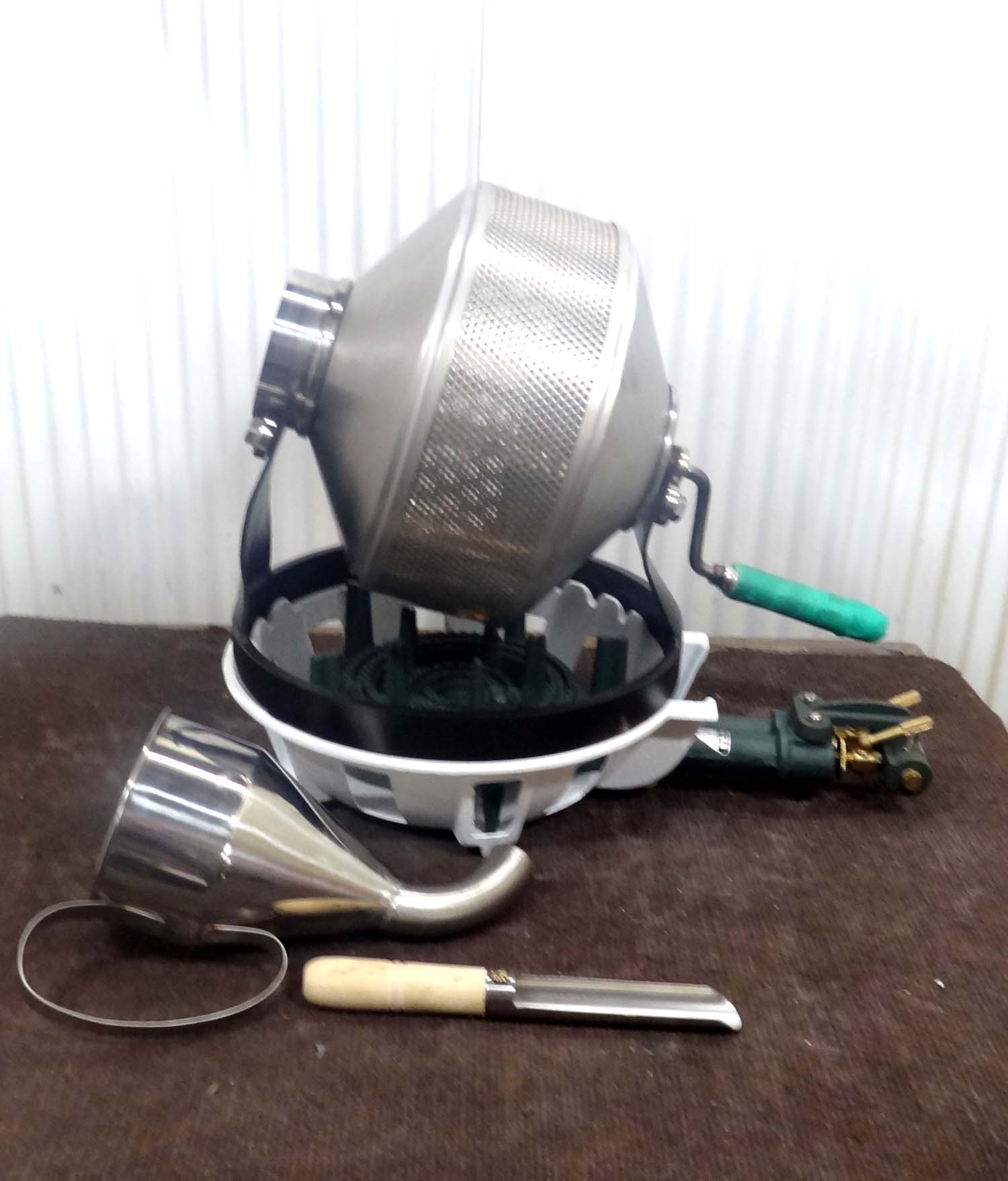 商品番号:A1200 手回し1kgコンロ付き 販売価格:18万 手回しですが電動にも可能ですプラス3万 バーナーは長いバーナーですので完全にムラ無く焙煎出来ます バーナーだけでも25000円します 1台のみですが10日後製作可能です 持ち上げ3角ステースプーン ベヤリング4個付き |